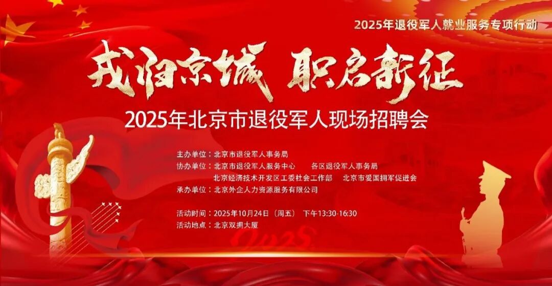 为深入贯彻落实党的二十大和二十届二中、三中全会精神,完善退役军人就业支持体系,促进退役军人高质量充分就业,按照《退役军人事务部等6部门关于开展退役军人就业服务专项行动的通知》要求,北京市退役军人事务局将于10月24日(星期五)13:30在北京双拥大厦举办“2025年北京市退役军人秋季现场招聘会”。诚邀北京市广大退役军人和随军家属参加!