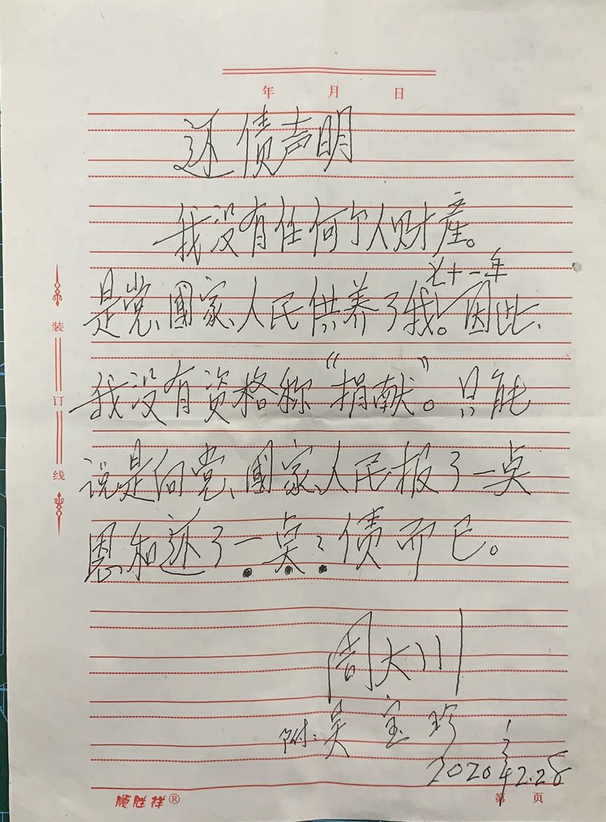 每逢组织捐款,他都带头响应。2008年汶川大地震,他心系灾区人民,捐款1000元。后来号召交特殊党费时,又带头交特殊党费1万元。 这次疫情发生后,他曾几次来到军休所要求捐款,都让军休所委婉地劝回了:您再等等吧,等统一组织的时候。因为他们知道,周老一家平时生活非常俭朴,他和老伴身体也不是很好,需要用钱的地方不少。这次周老的再次到来,一定是因为在新闻联播中看到习近平总书记和中央政治局常委响应中央号召,带头捐款的新闻后,又坐不住了。果不其然。只见他掏出了一个厚厚的信封,跟工作人员恳切地说:“这是我和老伴为疫情防控工作尽的一点儿绵薄之力,请组织收下。” 工作人员打开信封,细细一点,金额3万!一下子被镇住了。看到工作人员又要开口劝阻,老人从兜里掏出一份“还债声明”:“我没有任何个人财产,是党、国家、人民供养了我七十一年。因此,我没有资格称“捐献”。只能说是向党、国家、人民报了一点恩和还了一点点债而已。” 落款是两个人的笔迹:周大川、吴宝珍。2020年2月28日。 面对着3万元的捐款,工作人员对老同志的善举十分感动,再三婉拒。