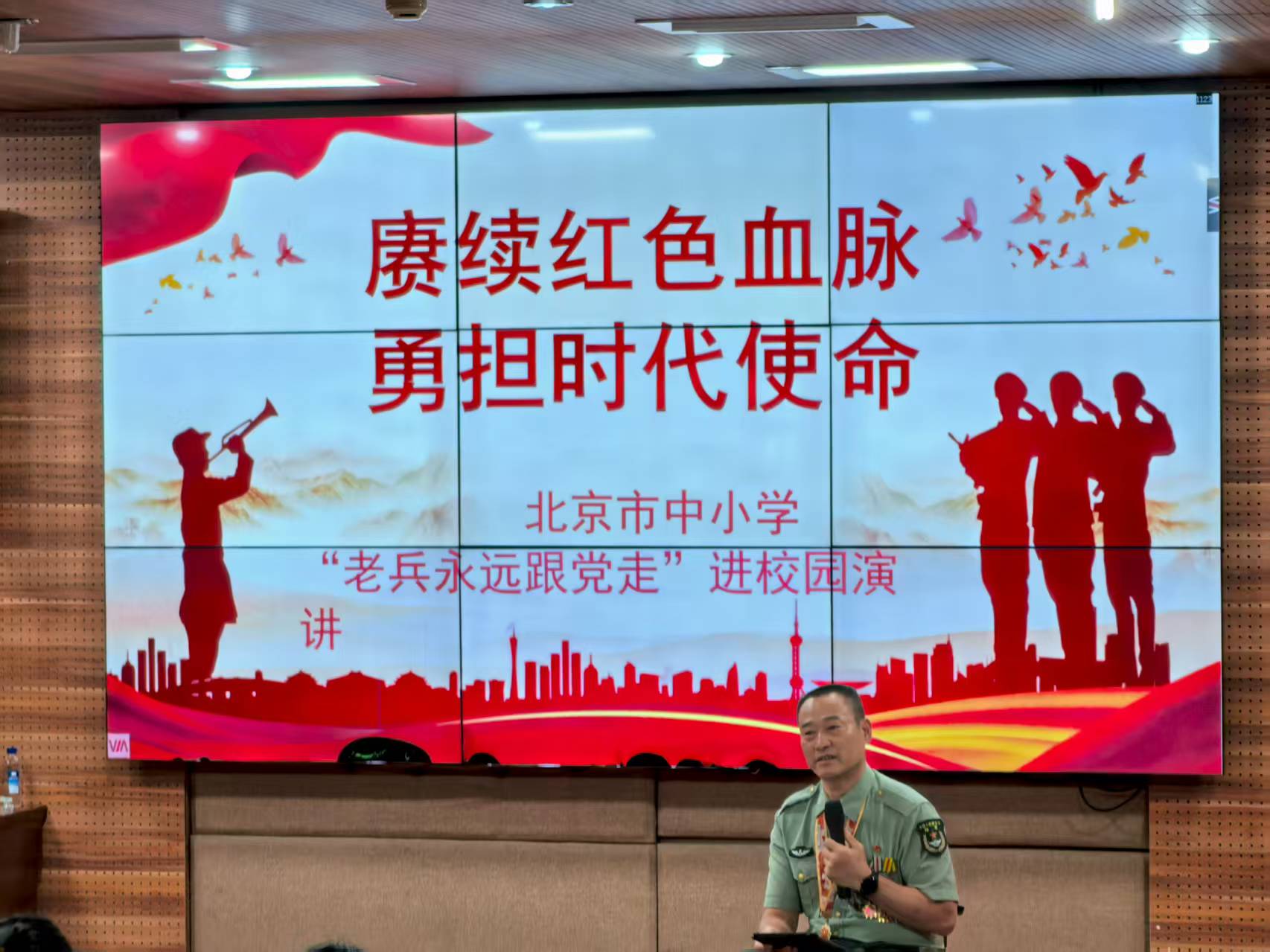 高米店街道北京景山学校大兴实验学校,邀请“一等功臣”老兵武连庆同志,以“赓续红色血脉 勇担时代使命 老兵永远跟党走”为核心分享自身经历。作为一名有着多年党龄的老兵,武连庆结合自己的军旅生涯与党员历程,深情讲述了自己身着军装时坚守边疆、保家卫国的峥嵘岁月,以及退役后始终以党员标准严格要求自己、积极参与公益服务的感人事迹。他用“一辈子跟党走”的坚定信念,诠释了老兵对党的忠诚与担当,让在场学生真切感受到红色血脉的力量。