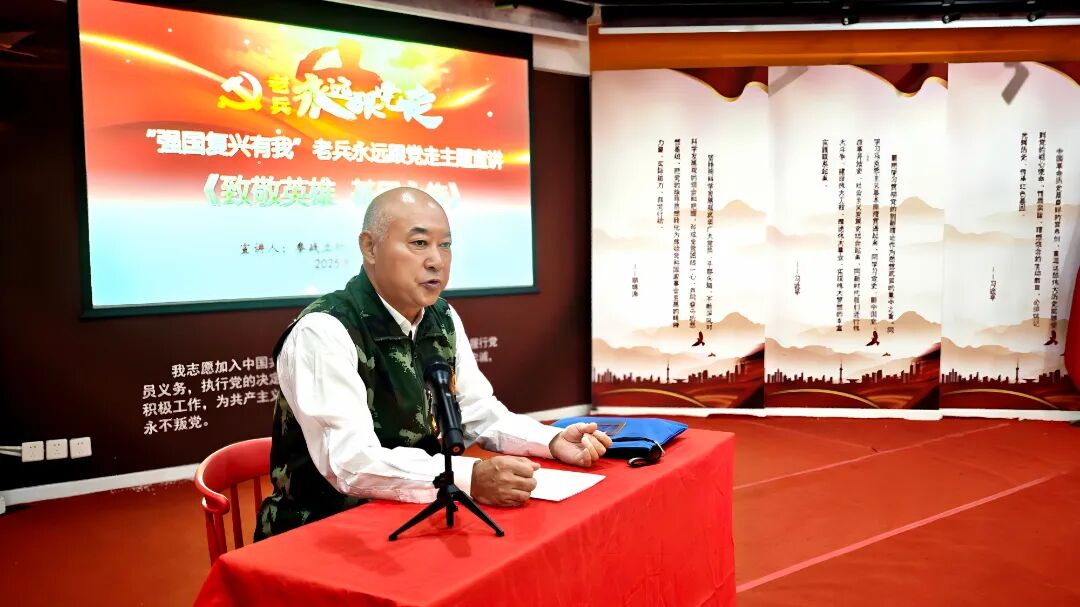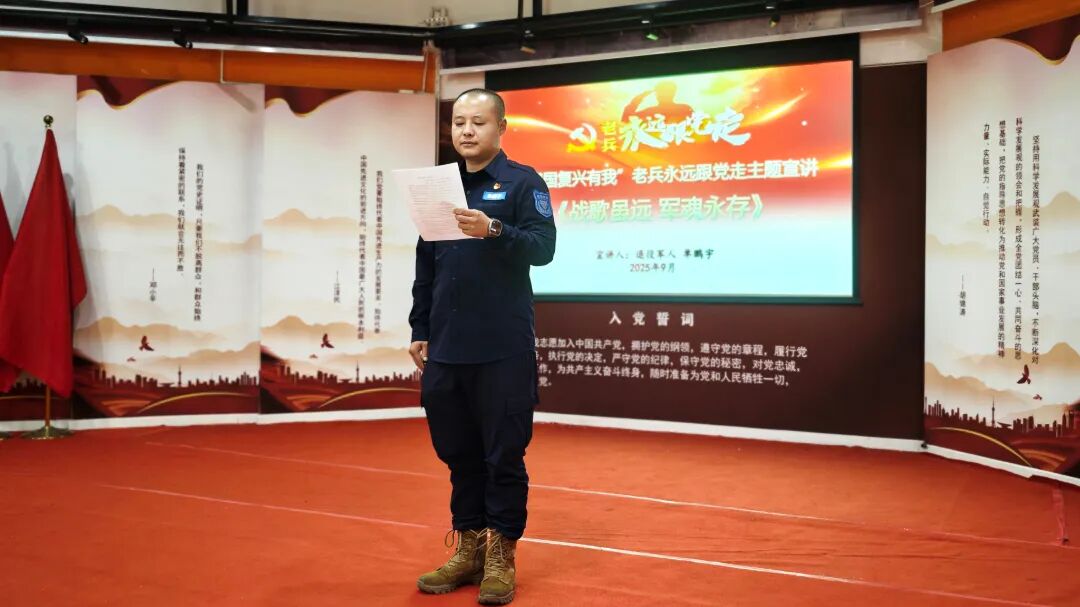 紧接着的“老兵永远跟党走”主题宣讲,两位退役军人代表先后分享人生故事。对越自卫反击战荣立二等功的退役军人崔志军,用朴实语言讲述战场上的烽火岁月——从枪林弹雨的生死考验,到坚守阵地的执着坚守,每一个细节都惊心动魄,每一份坚持都令人动容。退役军人单鹏宇则以《战歌虽远 军魂永存》为题,分享自己服役期间保家卫国的经历,以及退役后投身应急救援工作的点点滴滴。他们的故事没有惊天动地的豪言壮语,却以 “退伍不褪色、退役不退志”的初心,为现场观众上了一堂生动深刻的爱国主义教育课,让“奉献”与“担当”的精神内核深入人心。
